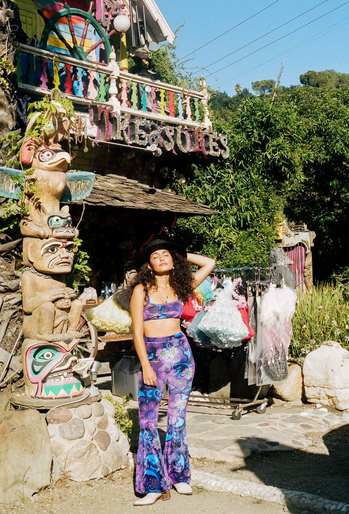 Decked out in our Juniper Flares in Deep Purple and bralette made from our exclusive fabric by Solstice Intimates.