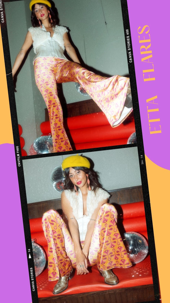 Unsere Etta Flares bringen die Art-Déco-Atmosphäre ein, die einen starken Hintergrund und Einfluss auf die Mode und das Design der 60er und 70er Jahre hatte, und verfügen über ein Motiv, das zu ihren Ohrringen passt!